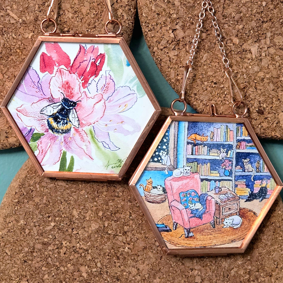 This double-sided artwork is framed in glass and metal. It can serve as an ornament or a flippable wall hanging. Prints are on premium UV protected paper and are reproductions of Lancaster County Artist, Jenna Minor Kline's paintings. This purchase includes 1 ornament with 2 images inside.